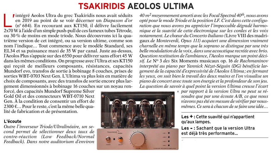 L’amplificateur intégré Tsakiridis Aeolos Ultra avait déjà marqué les esprits en 2019 en obtenant un Diapason d’Or. Avec la version Aeolos Ultima, le constructeur grec pousse encore plus loin les performances de cet amplificateur à tubes, tout en conservant les principes qui ont fait son succès.